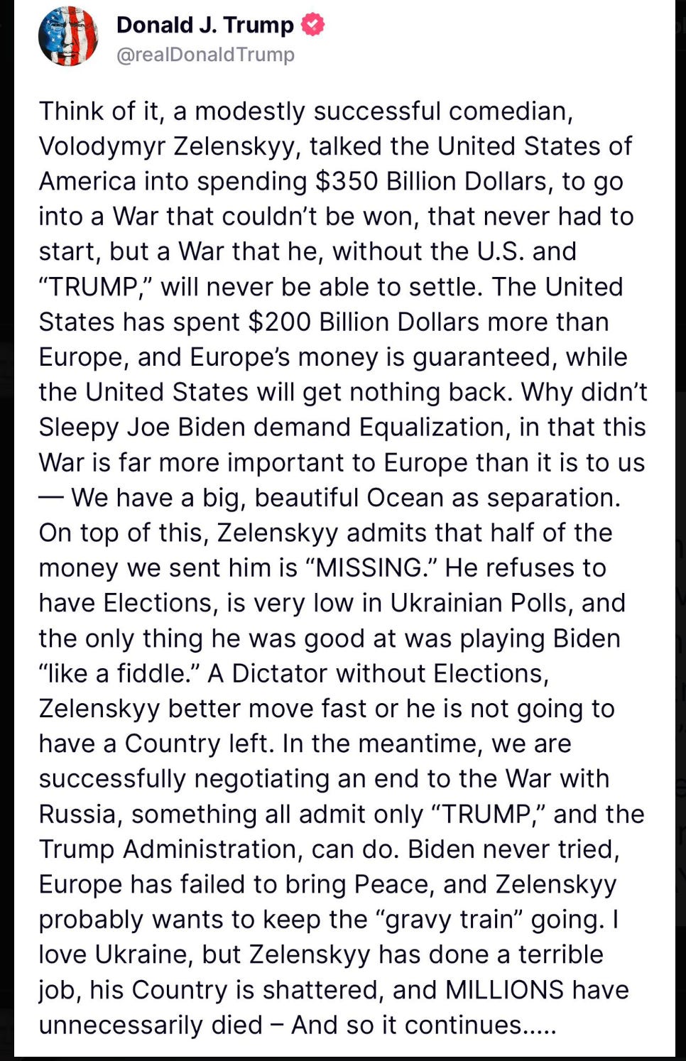 I have little idea why our President decided to post this(publicly) against his fellow entertainer-turned-politician Volodymir Zelenskyy. Don’t kid yourself into being surprised by it; Trump’s been telegraphing about cutting aid to Ukraine for nearly the past two calendar years. In the twilight years/months/weeks/hours of our present configuration of international relations with the US as the sole superpower, we’re witnessing not merely a series of tactical realignments but an unfolding of relations spurred upon primarily by our President that, as much as some subsets of American liberal sphere would like to believe and chirp that is caused by “Trump/Republicans being stupid,” which is a notion/belief that even if true, is still completely useless and ignores the real benefactors and proponents of a right-wing/nationalist American retreat from the global order we created for ourselves(post-WW2, Post-Cold War), through statements and tendencies like the Trump ramble, above(which I ‘personally’ have no interest in going through line by line), if you look close it’s pretty easy to see the contradictions inherent in the post-Cold War liberal order that Trump and anti-Ukraine Republicans are seemingly taking an axe to.